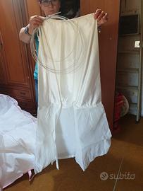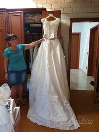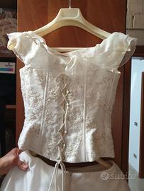 Abito da sposa color avorio, 2 pezzi: corpetto con perline, spalle cadenti, intrecciato dietro. Gonna in raso effetto nuvola, con rialzo a balze sul lato sinistro, coda, cerchio staccato con sottogonna. Velo lungo con bordino sottile. Tg.44. Indossato solo il giorno del matrimonio e subito portato in lavanderia. Conservato nel suo sacco originale.
