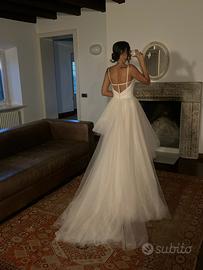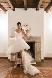 Abito da sposa in tulle voluminoso con strascico lungo e corto sul davanti.