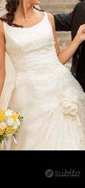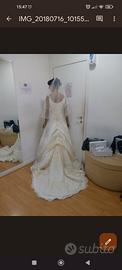 Vendo vestito da sposa bianco, pagato 1350€ scontato (costava 1550€), presenta pizzo ricamato sia avanti che sul retro del vestito. Lo vendo a prezzo scontatissimo insieme al velo e al portaabiti/custodia.