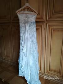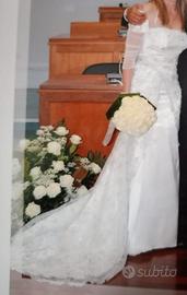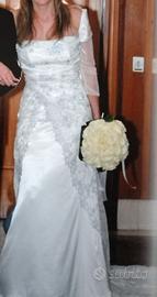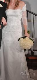 Abito a sirena, con coprispalle, marca VALENTINI, romantico, fine ed originale. Tessuto in seta pregiata SHANTUNG, con inserti in organza e tulle. Corpetto in pizzo lavorato a mano con particolari applicazioni di Swarovski. Veste una 40/42, altezza sposa 1.55 con 10 cm di tacco. Eventualmente scarpe in omaggio nr. 35. Possibilità anche di AFFITTO.