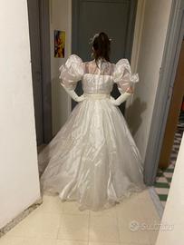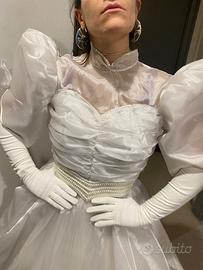 Abito da sposa in organza tg 42. Completo di sottogonna con cerchio e guanti lunghi in raso. Condizioni esterne perfette. All’interno presenta alcuni aloni gialli dati dal tempo ma non visibili dall’esterno.