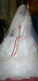 Abito da sposa bianco, con applicazione spilla di rose rosse che si possono togliere e stringatura rossa che si può sostituire, taglia 44 ma può andare bene sia per taglia 42 che per taglia 46, compreso di copri spalle bianco in raso, acquistato da Salem spose al costo di euro 3000, ovviamente indossato una sola volta, e dopo l’utilizzo lavato in tintoria, perfette condizioni, vendo zona ostia.