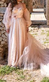 Abito da Sposa Oro Rosa. Taglia 44 con intreccio sulla schiena per stringere e allargare. Coda e maniche si possono staccare. Compreso di pellicciotto bianco, escluse scarpe.