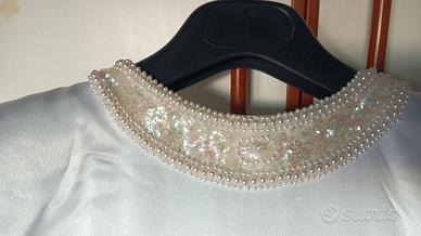 Abito da sposa anni 90 perfettamente conservato. Tessuto in raso fine di qualità. Decorazioni con perline di alta qualità e tutte perfettamente conservate. Coda lunghissima. Taglia forse 38/40 (?) non ricordo.