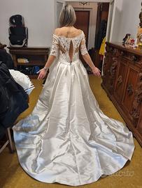 Abito da sposa taglia 44 con scollo a barca e corpino preformato completamente ricamato a mano. Ampia gonna in tessuto Mikado (tecnica giapponese di lavorazione della seta che la rende particolarmente luminosa) con tasche. Misure: Vita 86 cm - seno preformato 97 cm - lunghezza gonna davanti 106 cm - lunghezza coda 160 cm