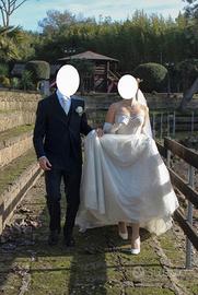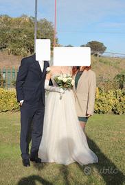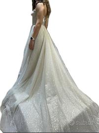 Vendo bellissimo abito da sposa ricoperto da meravigliosi brillantini. Scollo a cuore, misure della vita di 29/30cm, sul petto si puó regolare grazie alla chiusura posteriore con nastrino di raso. L'abito è color avorio con il tulle bianco. II tulle si è leggermente rovinato durante la cerimonia (visibile in foto) e l'abito si è leggermnte sporcato per fare le foto nel prato a Dicembre, ma (come è visbile dalle foto) soltanto la sottogonna, quindi non necessita per forza di un lavaggio perchè lo sporco non si vede. lo sono alta 168cm e peso 68kg, di solito porto una taglia S e ho una seconda di seno.