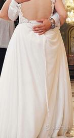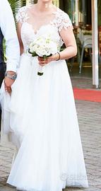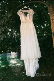 Abito da sposa romantico in pizzo e tulle, indossato una sola volta. Corpetto in pizzo floreale con maniche corte effetto tattoo e scollatura a cuore. Gonna morbida e fluida in tulle, molto leggera e comoda. Schiena parzialmente scoperta con chiusura elegante. Stile boho-chic, perfetto per matrimoni all’aperto o in location romantiche. Taglia: 42/44 (M/L) Altezza sposa: 1.67/1.70 Condizioni: ottime / lavato in lavanderia specializzata Prezzo: 300€ Possibilità di prova / spedizione.