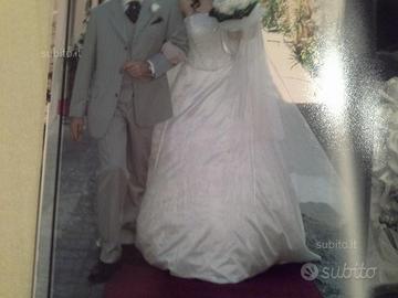 Vendo abito da sposa usato nel solo giorno del mio matrimonio (anno 2007), ma tenuto in buonissime condizioni. Lavato in tintoria e riposto nella sua custodia originale a garanzia di un perfetto usato. Acquistato nuovo presso il castello ducale di Fiano romano in Roma al prezzo di euro 5500, 00. L'abito è così composto: gonna larga e lunga con strascico di media lunghezza di colore bianco e in tessuto tafta con Swarosky sulla coda. Corpetto senza maniche ne' bretelle dello stesso tessuto e colore della gonna con motivi swarosky sul davanti. Velo lungo "Brillante". Cuscino porta-fedi e guanti corti in pizzo(con raso sul bordo) in regalo.