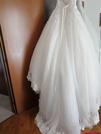 Scollo sulla schiena a cerchio, con chiusura a lacci (quindi utilizzabile per varie misure). Misura seno dalla terza alla quinta. Gonna con strascico, tutta brillantinata. Senza sotto gonna e senza cerchio. Tenuto ancora bene all'interno della sua custodia di sartoria. Acquistato nel 2023 a € 3.000.