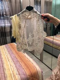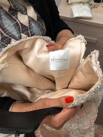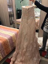 Elegante abito da sposa color cipria, con dettagli in pizzo e perline. Taglia M (senza etichetta) lungo c.a. 2 metri - Corpetto a cuore senza spalline. - Gonna a sirena con strascico. - Ricami floreali sul corpetto e sulla gonna.