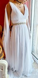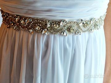 Abito bianco sartoriale italiano, stile impero, bellissimo. Assenza di strappi e macchie, comodo e morbido, si adatta bene a qualunque fisicità, con scollatura davanti e dietro. Molto elegante impreziosito con cintura di piccoli swarovski nel punto vita e lavorazione di paillettes sulle spalline. Chiffon che scende dalle spalline fino a fare un leggero strascico. Taglia 40