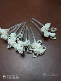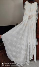 Abito da sposa completo di velo ,guanti, sottogonna con cerchio semirigido e fermagli per capelli. L' abito è realizzato a mano con corpetto in pizzo francese e maniche lunghe e scollo a barchetta. La gonna è formata da più strati di tessuto e lungo e ampio strascico tutto in pizzo. È stato indossato da una taglia 44-46 altezza 1,60. Si possono fare facilmente alcune modifiche come eliminare l'ultimo strato di tessuto della gonna. Il velo è lungo. L' abito presenta alterazioni di colore ( sono disponibili foto e chiarimenti) dovuti al passare del tempo .