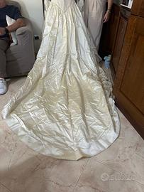 Abito da sposa degli anni 90, sartoriale, prodotto dall'atelier DE SIMONE. L'abito è in seta e pizzo decorato a mano con applicazioni e perline. Le maniche sono ricamate a mano con un vedo non vedo, così come il corpetto, interamente decorato. Il colore dell'abito è avorio e non è un colore dettato dal tempo ma il colore originale della seta pura. L'abito è dotato di un'elegante coda in seta e del suo velo, bordato interamente in pizzo francese. La taglia è una 40. Le condizioni sono ottime e il modello è in linea con le tendenze degli abiti 2026.