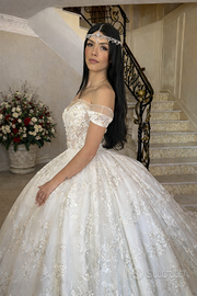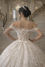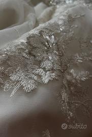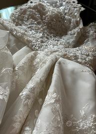Stupendo abito da sposa Di sartoria milanese in pizzo ricamato colore bianco panna Nuovo, ma usato per esposizione. L’abito potrebbe aver bisogno del servizio lavanderia.