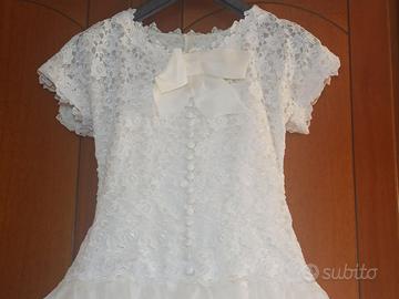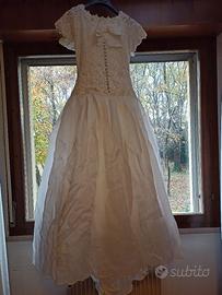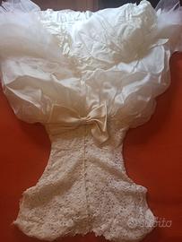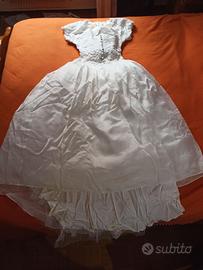 Abito modello principessa,corpetto in pizzo con fiocchi amovibili, sottoabito in raso con spalline , gonna in tulle di seta, sottogonna composta da quatto strati di tulle di cotone. L’abito per essere utilizzabile, necessita ovviamente di una rinfrescata e stiratura.