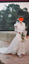 Pizzo decorato con paillettes e strass tutte applicate a mano, sottogonna e strascico in goffrato.