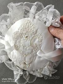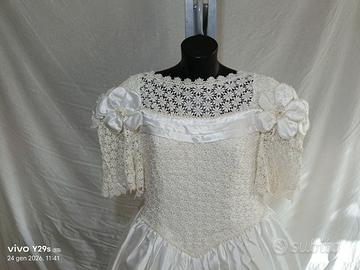Abito da sposa taglia 48 confezionato su misura, corpino con prezioso pizzo bianco macramè e gonna in raso. Compreso pure sottogonna in voile. Arricchito da perle, punti luce e paillette. Accessori inclusi velo di 5 metri, guanti, cuscino porta fedi coordinato all'abito. Misure: Circonferenza vita cm. 96 circa; - Larghezza spalla spalla cm. 50 circa; - Lunghezza abito (davanti) circa cm. 140; Larghezza coda 240 cm; Lunghezza velo 5 metri. Va benissimo per una donna di statura media (io sono alta cm. 165)- Ulteriori misure a richiesta, Posso fornire tante altre foto per i dettagli. . L'abito è stato lavato e disinfettato da lavanderia specializzata. L'abito ha portato bene. Prezzo trattabile.