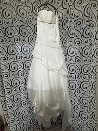 Vendo abito da sposa TG 44. Il vestito si può allargare perché al suo fianco sono presenti nastri di tessuto rosso (vedi foto) nell'abito sul fianco sx era attaccata una rosa di tessuto rosso (vedi foto) l'abito risulta a fascia con dei brillantini bianchi e rossi. Il prezzo pagato era 2700€ svendo perché non ho più posto nell'armadio. L'abito non presenta nessun tipo di ingiallimento.