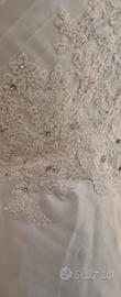 Abito da sposa in raso avorio ed organza morbida fatto a mano senza spalline con gonna poco voluminosa (sottoveste corta in cotone, due strati sottili di tulle, uno strato di raso), perline di vetro e pizzo delicato ricamati a mano, reggiseno imbottito con chiusura interna e posteriore, lacci intrecciati in raso che danno la possibilità di stringere o allargare il corpetto dell'abito. Andrebbe bene a chi misura fino ad 1,70m di altezza e veste 40/42