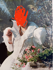 Abito da sposa in seta avorio con perline sul corpetto davanti e dietro, nelle maniche a 3/4 e nel colletto. Con coda. Taglia 42/44