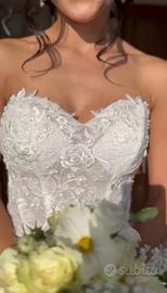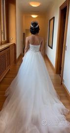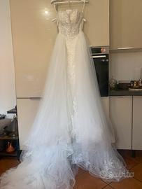 Abito da sposa Loretta Italia sirena con sovragonna indossato solo per un paio d’ore. Condizioni perfette, come nuovo. ✨ Dettagli: Taglia: XS/S Modello: sirena aderente con sovragonna removibile effetto principessa Tessuto: pizzo ricamato e tulle Corpetto strutturato senza spalline Strascico lungo e scenografico Colore: bianco/avorio 👗 Vestibilità: leggermente adattato in sartoria per valorizzare la figura (taglia XS ma che può vestire anche S). Altezza: 1,55m/ 1,65m (con tacchi). Sono comunque presenti margini di modifica per eventuali aggiustamenti. 💎 Condizioni: impeccabili, già pulito 💰 Prezzo:950€ ✨ Due abiti in uno: risparmi senza rinunciare a nulla. Look elegante e voluminoso per l’ingresso, look sirena aderente, sensuale e pratico per ballare e muoverti liberamente. Disponibile per altre foto e misure!