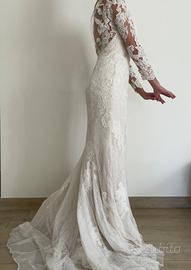 Scollatura profonda sulla schiena con tulle e dettagli di ricami in pizzo e bottoncini avorio.