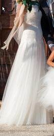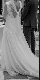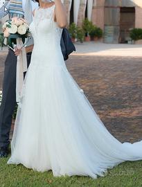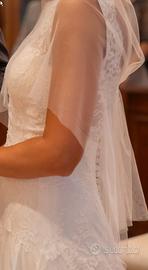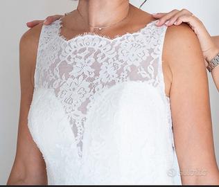 Splendido abito da sposa a vita bassa e senza maniche con scollatura a barca sul davanti e profonda scollatura a V posteriore, con dettagli in pizzo. È stato leggermente accorciato (sono alta 1,70 e indossavo sandali con tacco 8 cm) e stretto in vita (le mie misure: 85 x 76 x 97 cm). Le coppe che sono state aggiunte si possono levare. Già lavato e stirato da una lavanderia professionale, indossato solo il giorno del matrimonio avvenuto un sabato pomeriggio di agosto 2024. Regalo coprispalle da indossare in chiesa in tulle, pagato a parte. Per ulteriori foto o informazioni sono a disposizione.