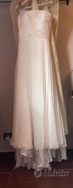 Vendo abito da sposa stile impero, va portato in lavanderia dato che ha delle macchie di cloro che si possono vedere anche dalle foto. Compreso c e un foulard e la sua custodia per abito.