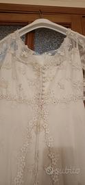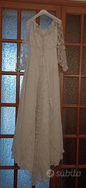Abito da sposa stile impero Pierre Cardin colore avorio taglia 44 con maniche in tulle con fiori di pizzo e perline che si ripetono nella zona pettorale e dorsale. Gli intarsi di pizzo proseguono lungo la coda dell'abito. Disponibile custodia abito firmata Pierre Cardin. Usato una volta e lavato al lavasecco. Lunghezza frontale da spalla a terra 150 cm. Misure giroseno 90, girocinturino busto 72, vita 80, fianchi 90.