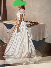 Vendo abito da sposa tutto un pezzo stile impero color avorio misura 40/42. Esattamente come in foto. Parte alta, giro collo e spalline in pizzo. Con sottogonna fatta a mano e velo lungo ricamato a mano.