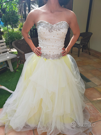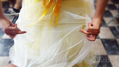 Vendo abito da sposa pagato ?1300 con gonna in tulle, corpetto con ricamo e decori. Il vestito ha tulle, perline e nastro del corsetto giallo.