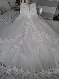 Incantevole abito da sposa stile principesco. Aderente corpetto arricchito da pizzo e perline con reggiseno eventualmente removibile (se non necessario) e ampia gonna in tulle a strati e con applicazioni in pizzo.
