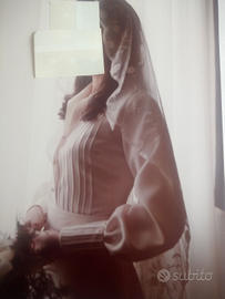 Abito in cadi composto da camicetta con piegoline e gonna lunga euro 200. Con velo mantiglia spagnola euro 400. Modello unico di alta sartoria.