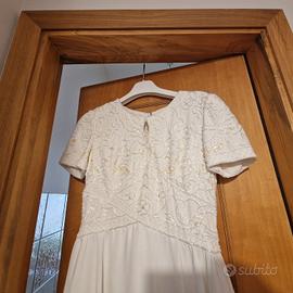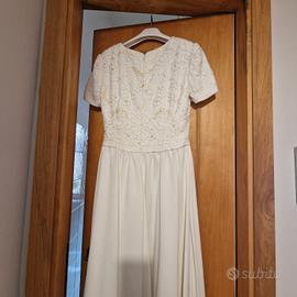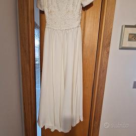 Vendo abito da sposa taglia 42 in tessuto viscosa. Ditta Pronovias. Colore bianco sporco/avorio. Corpetto con strass e perline. Attaccatura stile impero con strascico a coda di rondine.