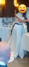 Abito da sposa incantevole, completamente in raso, cintura di strass , spacco lato sx, coda media con al centro una fila di bottoncini , con stola .