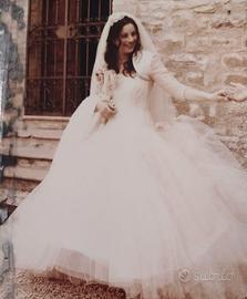 Vendo abito da sposa perfettamente conservato, pagato 4000 euro...tulle e pizzo, inserti floreali, corpetto con fasce rigide e allaccio retro regolabile, coda, strato più interno con anello per tenere la rotondità...taglia M ma assolutamente modificabile...Velo di circa 6 m in pizzo...pari al nuovo...solo da lavare...