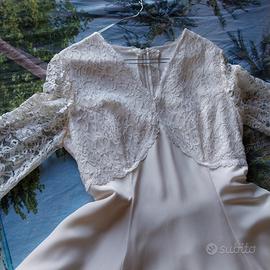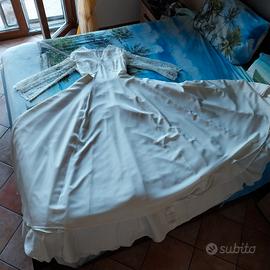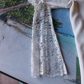 lunghezza davanti 146cm lunghezza con strascico 170cm, lunghezza manica 53cm, larghezza vita 70cm. maniche in pizzo ma non ricordo il tessuto del vestito che ha fodera pesante e copertura leggera. disponibile per la prova se si è vicini logicamente e per la spedizione. Ha qualche piccola macchia ma,potendo