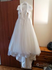 vendo abito da sposa tg 48 in raso e pizzo con corpetto semirigido e spalline in pizzo. piccolo strascico. coordinato di coprispalle e sotto gonna.