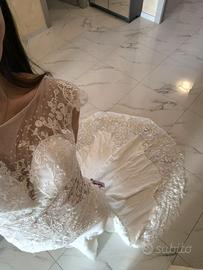 Vendo abito da sposa nuovo con cartellino ! Il vestito è un modello lungo, con spalline trasparenti. Il corpetto è ricamato in pizzo, mentre la gonna è molto semplice, con qualche dettaglio ricamato. Lo strascico è molto importante ed è anch'esso ricamato col pizzo. Lo scollo dietro è a V, si allaccia metà con la zip e metà con i bottoncini. È un abito molto bello, si può utilizzare per tutta la cerimonia o anche come cambio durante l'evento Le misure sono nell'ultima foto. È leggermente stropicciato in quanto chiuso nell'armadio, è da stirare.
