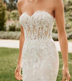 Abito dal doppio design grazie alla sovragonna removibile, silhouette a sirena, con pizzo in rilievo e fodera color nude, corpetto con spalline removibili (sono attaccate con bottoncini automatici), manicotti removibili.