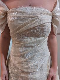 corpetto con delicato ricamo ad intarsio e perline, gonna con sottogonna e fasce per cerchio.
