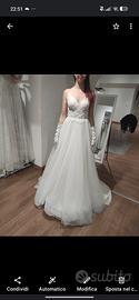 abito da sposa acquistato da atelier 'COME IN UNA FAVOLA' di Roma nell'anno 2022, color bianco naturale, taglia 40 (S), con ricamo di perline sul corpetto, scollo a cuore, spallina sottile, gonna ampia con tulle brillantinato(in foto non si nota molto ma ha i brillantini molto fini su tutta la gonna), strascico non troppo lungo. (guanti non inclusi, velo non incluso). Prezzo leggermente trattabile.