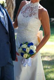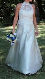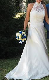 Vendo abito da sposa taglia 40/ 42 in raso di seta colore avorio con strascico, bustino in pizzo macramè con perle, fiocco dietro la scollatura, in buone condizioni. No perditempo grazie.
