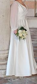 Vendesi abito da sposa in ottime condizioni, usato solo 3 mesi fa, bellissimo tessuto in mikado di seta, maniche in chiffon con polsino sempre in seta e bottoncini ricoperti in seta, allacciatura molto bella dietro sempre con lacci in seta regolabile, taglia 48 (ovviamente regolabile e adattabile). Vendo a € 350.