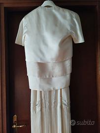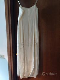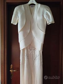 Abito da sposa bianco composta da: vestito a spallina (slip dress) lunghezza alla caviglia, in seta con applicazioni di perline e frange, giacchina in seta, mezza manica a strati sovrapposti. Taglia 40. Completo di custodia porta abito originale.