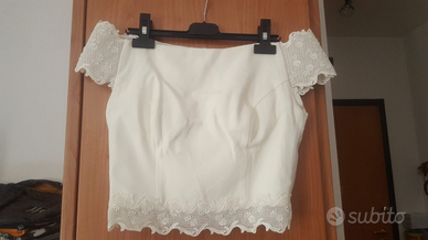 Vendo per conto di un'amica abito di alta sartoria composto da 2 pezzi. Un corpetto con pizzo e una gonna con strascico. Per completare la composizione guanti e velo come fa foto. Taglia 44. Eventuale spedizione a carico dell'acquirente. Prezzo trattabile.