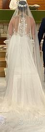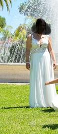 Il corpetto è ricamato e il retro e trasparente con bottoncini bianchi,gonna morbida di chiffon e seta pura.Insieme al vestito vendo anche le scarpe numero 39, velo a madonnina ricamato come il corpetto,accessorio per capelli,mantellina in chiffon per la sera, e porta fedi