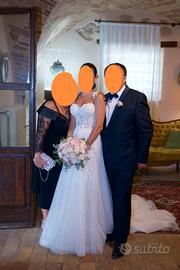 Abito da sposa con strascico lungo, sottogonna glitterato, corpetto ricamato in pizzo ornamentato con brillantini e perle. Spalline sottili con ricamo in pizzo, brillantini, perle. Altezza sposa 165. Misura vestito 42. Possibilità di provarlo in provincia di Varese. Pagato 3400 €.