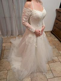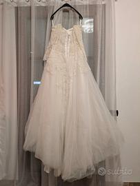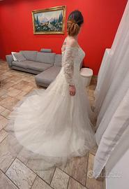 Abito da sposa colore bianco, con applicazioni in pizzo con brillantini, completo di velo