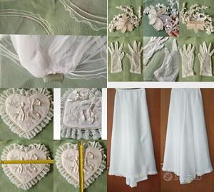 Abito da sposa compreso di velo, guanti, pettinina capelli, cuscino porta fedi. Descrizione ⤵ Abito molto particolare, ricamato nei minimi dettagli, gonna ampia e voluminosa con più strati, sottogonna con apertura per cerchio, strascico del vestito 1 metro. Gonna anteriore lunga 100 cm, gonna posteriore lunga 122 cm. Abito con corpetto rifinito con perle, ricamato, tessuto trasparente e foderato. Modificabile sia per il periodo estivo e sia per il periodo invernale. Strascico del velo 3 metri, velo rifinito ai bordi con due file di paillettes su tutta la lunghezza. Pettinina molto brillante per le perle e per i glitter che ci sono nei fiori, adattabile per ogni pettinatura. Guanti corti a rete bianchi. Dettagli e misure in foto. Per maggiori informazioni e misure scrivetemi.